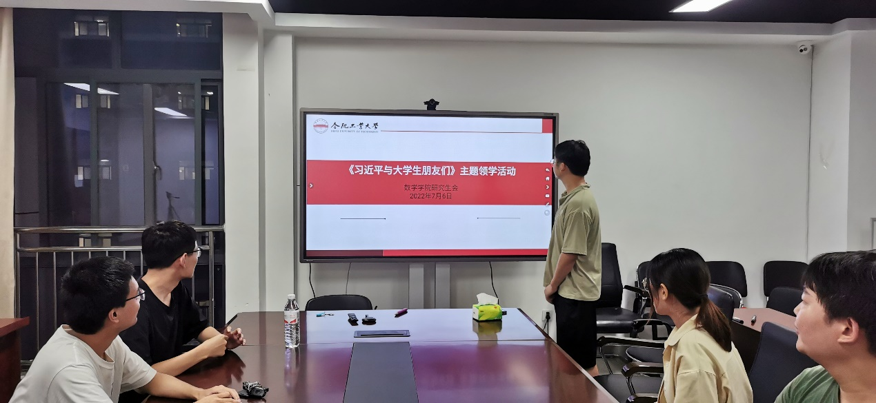 2022年7月6日晚,数学学院研究生会在翡翠科教楼B座1710室组织开展“习近平与大学生朋友们》主题领学交流活动,研究生会全体成员参加了本次活动。本次活动以“喜迎二十大,奋进新征程”为主题,由主席团成员郝玉祥同学主持,选树学生骨干领读分享,以专人领...