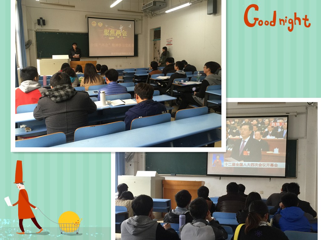 3月5日上午9:00,数学学院翡翠湖校区党支部全体党员、入党积极分子在翡翠湖校区六教101,通过互联网观看了十二届全国人大四次会议开幕式直播,仔细聆听了国务院总理李克强同志所作的政府工作报告。 开幕式四项议程全...
