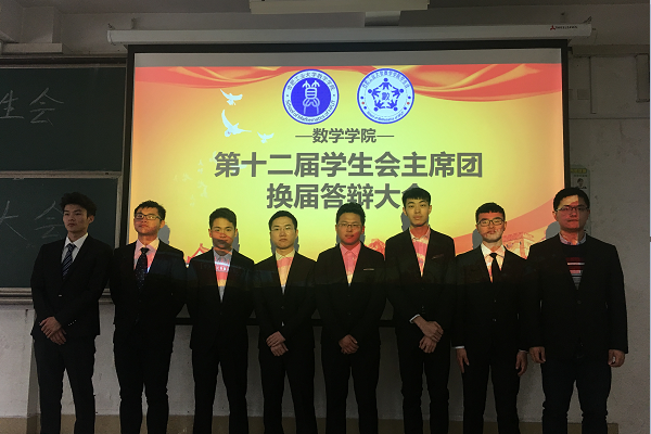 3月17日下午,数学学院学生会第十二届主席团换届答辩大会在翡翠湖校区五教101召开举行。学院团委、学生会负责老师、学生会全体成员和2016级、2017级各班班委参加了此次大会。 在奏唱团歌后8位竞选同学分别从自身情况...