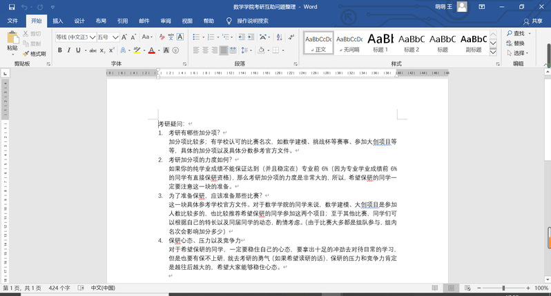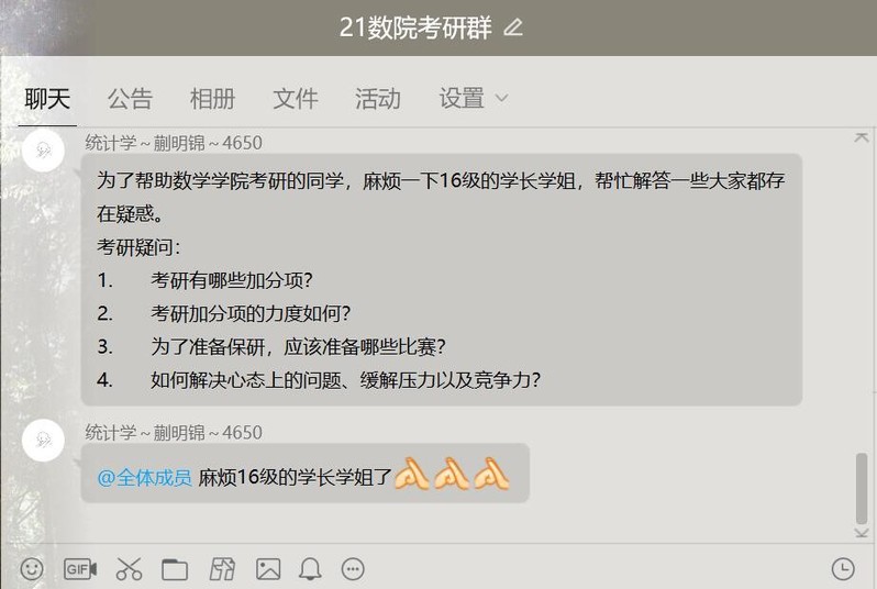“考研互助”模块以免试研究生、已考研的同学与拟考研同学的资料分享、信息沟通为主要互助内容。按照历年数学学院学生考研报考方向,将拟考研的同学分为数学、计算机、金融和其他等4个小组,免试研究生、已考研的同学按类编入,分别组成QQ群和微信群,在其中分享院校报考信息、考研资料,交流复习心得等等。