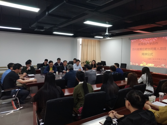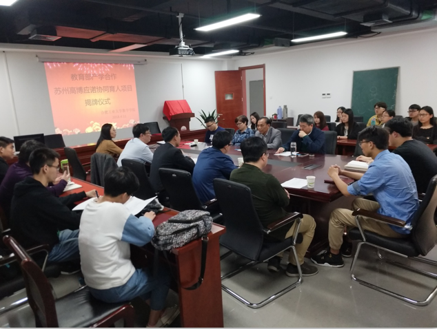 在揭牌仪式上, 我院与苏州高博应诺信息科技有限公司签订了协同育人项目合作协议。双方就目前在多元复合型人才培养中迫切需要的理科背景、实践项目开发、基地建设等问题进行了深入细致的交流,确立了“资源共享、优势互补、合作共赢”的共同发展目标,发挥教育合力, 提升人才培养质量。揭牌仪式由我院张莉副院长主持,王青山副院长和周世峰总经理分别代表双方发表了讲话,他们共同强调了产学合作的必要性和可行性,讨论了目前合作模式的优缺点,并就下一步继续深化合作提出了若干意见和建议。最后,我院殷明教授做了总结讲话,殷明教授是我院产学合作工作的发起者之一,多年以来一直积极推动协同育人事业的发展。殷明教授先是肯定了双方近十年以来在产学合作上取得的成果,并寄语希望双方共同努力,把产学合作协同育人事业提升到一个新的高度。