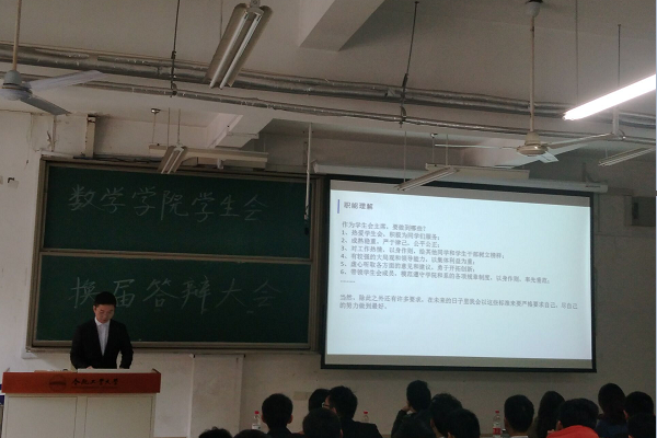 在奏唱团歌后8位竞选同学分别从自身情况、学生会工作收获、岗位认知、工作计划、学生会存在的问题及解决对策等方面进行自我展示。答辩同学张弛有度,各显特色,显现出数学学子蓬勃向上的风采。