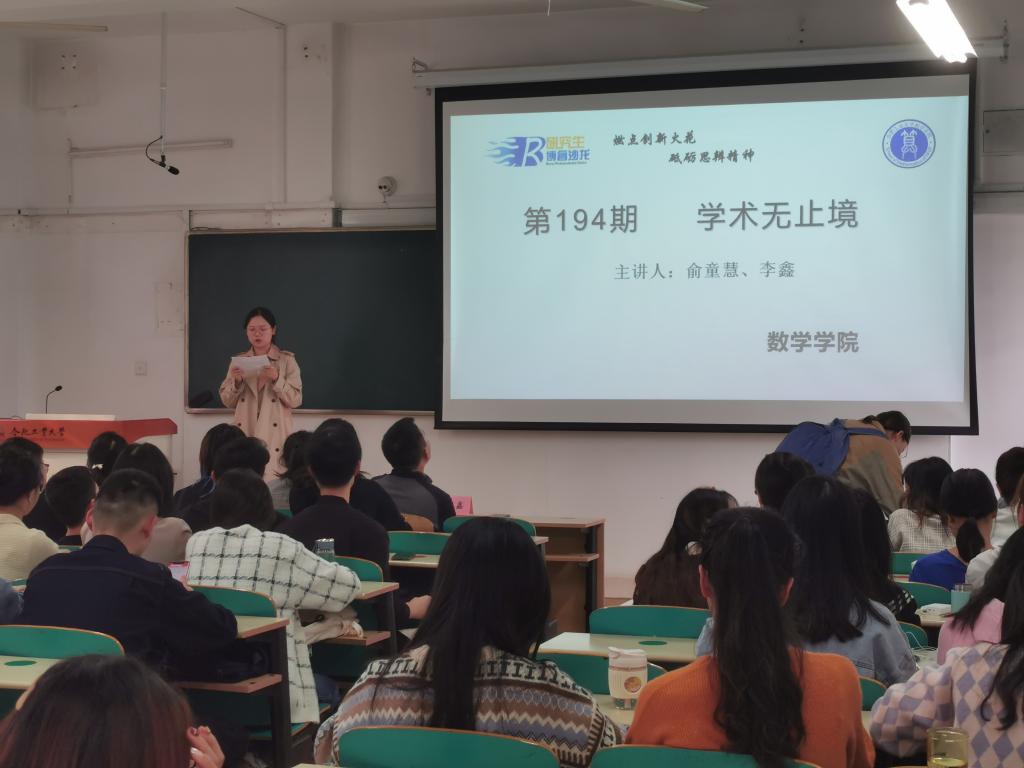 为帮助研究生进一步做好学业规划,培养研究生的学术兴趣,浓厚学习氛围,2021年11月2日下午,数学学院于翡翠湖校区十教202室成功举办了学院第194期研究生博睿沙龙。本期活动以“学术无止境”为主题,邀请到学院优秀青年教师李鑫和俞童慧主讲,百余名数学学院研究生参与活动。