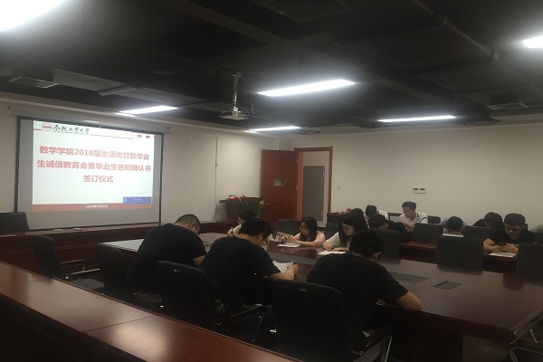 5月4日下午,数学学院2018届生源地贷款毕业生诚信教育会暨毕业生告知确认书签订仪式在翡翠湖校区翡翠科教楼东楼1710举行,学院全体2018届生源地贷款毕业生参加了活动。