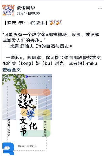 为了促进疫情期间学生身心和谐,涵育文化素养,深化疫情居家第二课堂不断线,激发学生参与数学、探讨数学、热爱数学的热情,3月14日数学学院2020年“π”节活动依托网络平台多渠道、全方位开展。