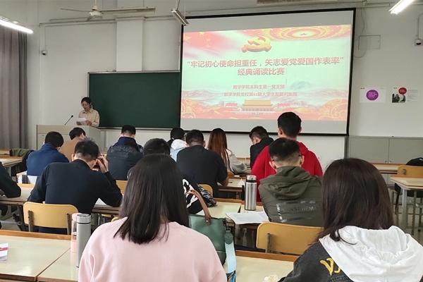 10月30日下午,数学学院本科生第一党支部于翡翠湖校区四教205举行了“牢记初心使命担重任,矢志爱党爱国作表率”经典诵读比赛,数学学院党校第62期大学生发展对象班全体学员参加了本次比赛。 比赛现场,发展对象班的...