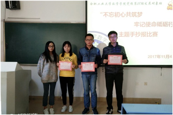 为学习党的十九大精神,11月4日数学学院第58期发展对象班于翡翠湖校区六教108开展了“不忘初心共筑梦,牢记使命砥砺行”主题手抄报比赛,数学学院信息与计算科学系教工党支部及翡翠湖校区本科生第一、第二党支部党员代表出席并担任评委。