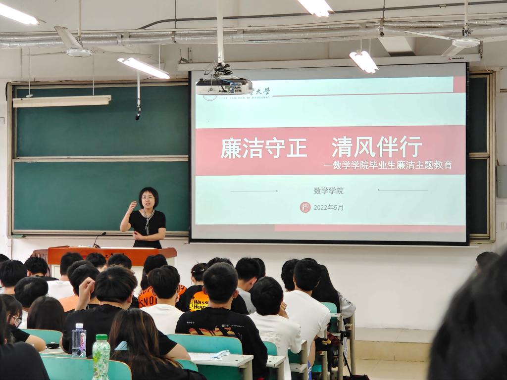 近日,数学学院“廉洁守正 清风伴行”毕业生廉洁教育主题活动在翡翠湖校区举行,学院2022届本科毕业生参加此次活动。